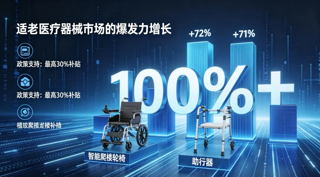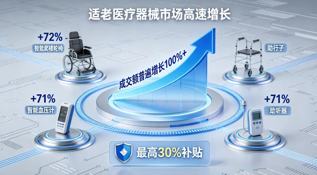 医疗器械是适老产品中增长最快的领域之一。2024年电商大促期间,电动轮椅、助行器、智能血压计、助听器等产品成交额普遍实现100%以上增长。其中,智能爬楼轮椅销售额增长72%,助行器销量增长71%。在部分地区开展的适老化消费补贴活动中,医疗器械类产品享受最高30%的补贴,有效激发了市场需求。此类政策模式为全国适老产品推广提供了参考。