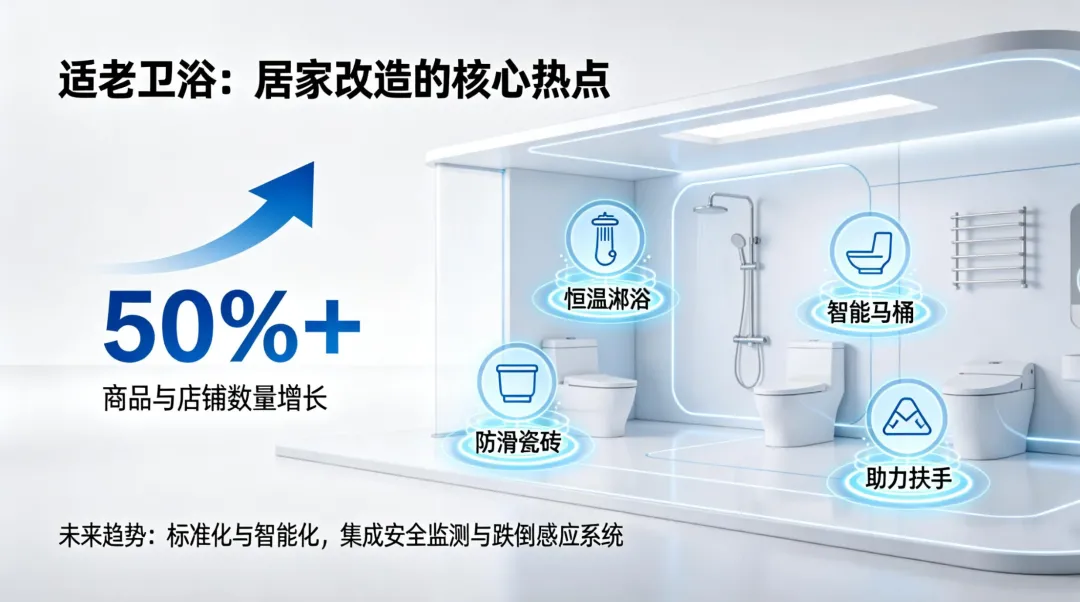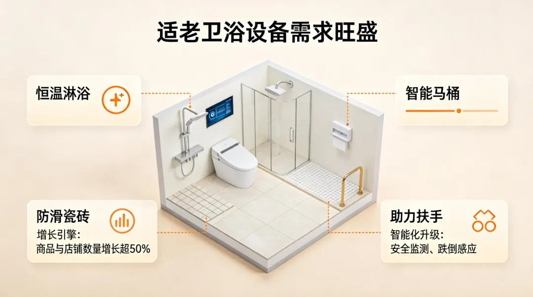 卫生间是老人跌倒高发区,适老卫浴设备因此成为热点。市场对恒温淋浴、智能马桶、防滑瓷砖、助力扶手等产品需求旺盛。2025年起,多家企业与卫浴品牌达成战略合作,计划共同推动适老卫浴产品的标准化与智能化,开发具备安全监测、跌倒感应等功能的系统。