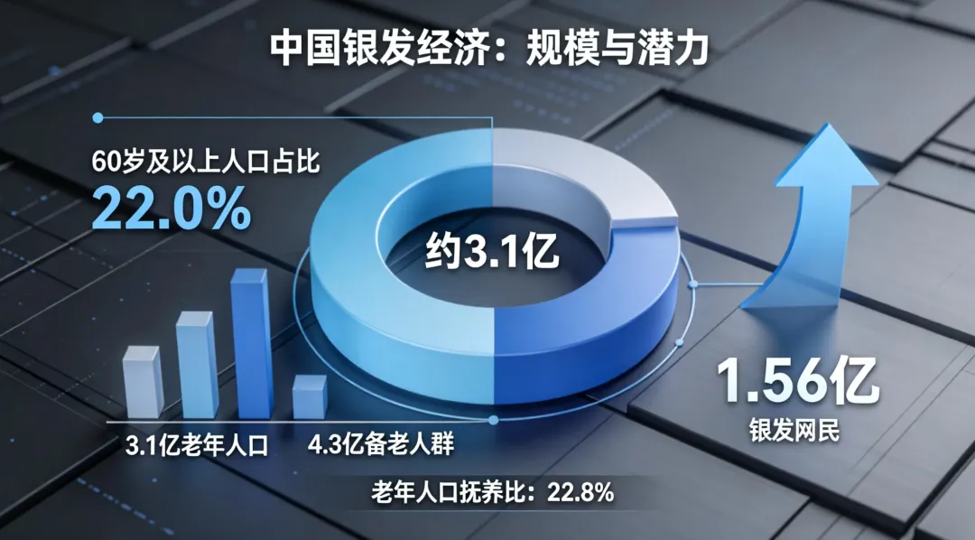 截至2024年底,全国60周岁及以上老年人口约3.1亿,占总人口比重22.0%,较上年增加约1334万人。其中65周岁及以上人口约2.2亿,占比15.6%。老年人口抚养比达22.8%。同时,“银发网民”规模约1.56亿,数字化适老化改造持续推进。广义银发经济目标人群包含约3.1亿老年人口及4.3亿40-60岁“备老人群”,市场潜力广阔。