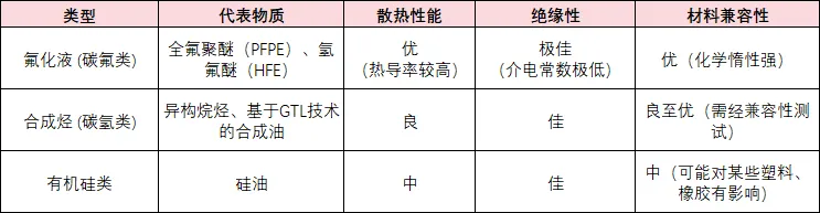 根据化学基础,主流浸没冷却液可分为三大类,其性能与应用对比如下: