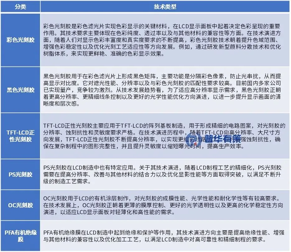 根据应用场景与技术特点的不同,显示用光刻胶主要可分为LCD用光刻胶与OLED用光刻胶两大类。