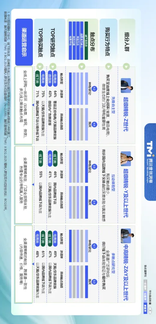 消费趋势呈现三大特征:一是品类多元化,奢侈品仍占核心支出但短期承压,高端实物(尖端智能、高端户外鞋服)与高端体验/服务(高端旅行、医美美容)分流需求,钱包份额分别增长2%和3%;二是人群分化显著,Z世代超级精锐消费韧性最强,偏好小众个性、多元品类,受经济波动影响小,而中高精锐更务实,注重品质与性价比;三是全渠道融合,中高精锐倾向多触点研究后决策,Z世代超级精锐引领线上研购一体化,微信生态、短视频平台、电商平台分别承担服务、种草、交易核心功能。