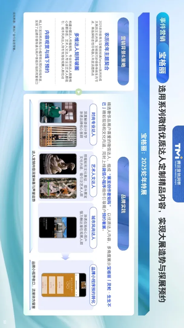 营销层面,报告给出四大策略:达人深度合作构建分层矩阵,覆盖种草到转化全链路;技术创新加持,如XR直播打造沉浸体验;内容定制化,通过纪录片、专题活动传递品牌精神;用户运营深耕微信生态,以稀缺权益与私域融合提升忠诚度。典型案例包括宝格丽借势生肖节点实现展览预约转化、FILA GOLF用XR技术打造跨时空大秀、特仑苏以稀缺权益强化会员黏性。