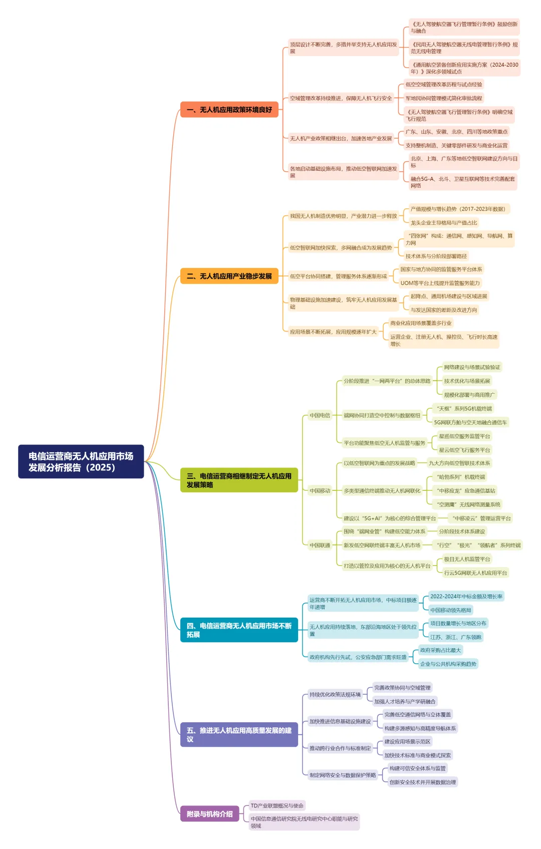 本报告由TD产业联盟与中国信通院联合发布,系统分析了中国无人机应用的政策、产业基础,并重点聚焦三大电信运营商的市场策略与表现。以下是基于报告原文图表及数据的核心要点总结: