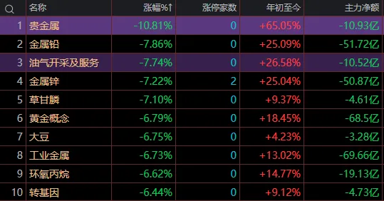 今日有色金属板块跌幅居前,黄金板块跌停!油气、农业跟跌;主要原因受到外围金现、银现重度下跌原因导致,目前黄金白银三个交易日的跌幅直接抹平了近一个月以来的涨幅,导致资金集中出逃,出现大面积踩踏现象。1.短期上涨幅度过高;此原因实为其次,因为如果有消息催化,走出一浪高于一浪的行情其实并不为过!2.期货的逼空提前透支了市场预期;这就相当于短期的想象空间已经被提前兑现了!此时如果没有新的消息催化甚至是出现偏离空的消息,向下的阻力是最小的,空头是会率先反攻的,并且力度会非常大!3.沃什当选美联储主席,加速空头的动作;很多人不明白跟他有什么关系?这个逻辑主要来自于他的立场观,怕老鹰穿了一件鸽子皮,虽然本次他嘴上顺从了老特了意思,但是市场还是怕他那颗缩表的心,而美元与黄金实际上是一个跷跷板的效应,缩表之后美元就会变得稀缺,美元一旦值钱,那对于黄金作为跷跷板的另外一边就得哐当落地。