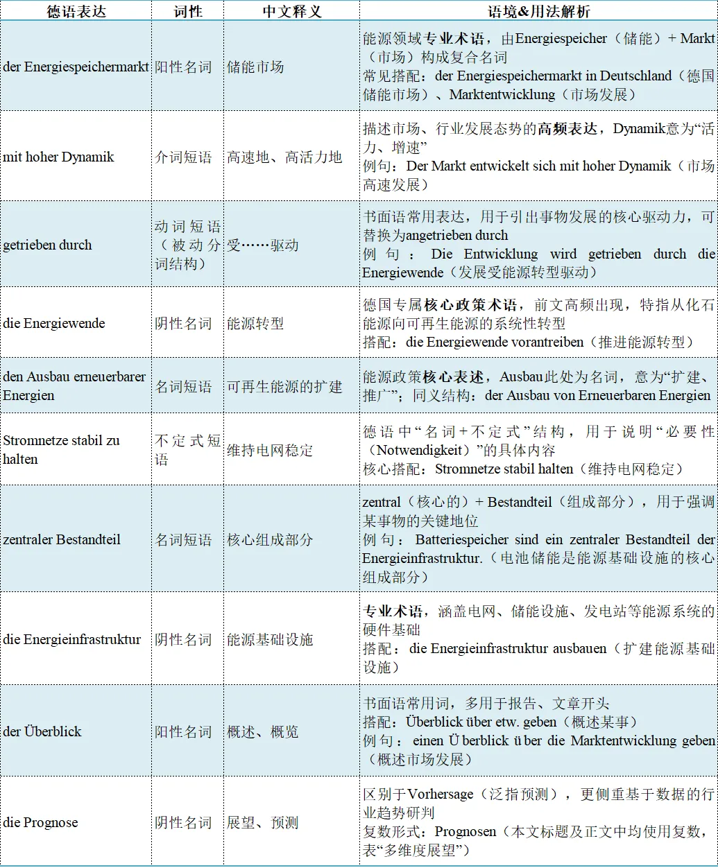 这段文字是德国储能市场分析的开篇总起段,核心作用是点明市场发展的核心驱动力(能源转型、可再生能源扩建、电网稳定),并引出后续的具体分析方向。文中将电池储能定位为“能源基础设施核心组成部分”,也体现了德国对储能产业的战略重视——这与前文提到的“储能是能源转型成功的关键”形成了逻辑呼应。
