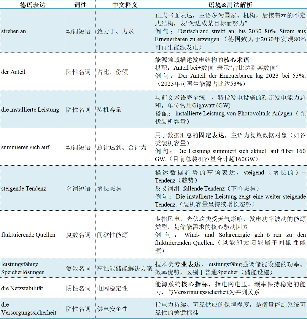 这段文字通过核心数据对比,清晰论证了储能需求增长的必然性:德国可再生能源发电占比已过半,但光伏、风电的间歇性特征,决定了储能容量必须同步扩张,才能避免电网波动、保障供电稳定。文中160GW的风光总装机容量,也从侧面解释了为何2030年储能需求会高达104GWh——二者存在直接的供需关联。