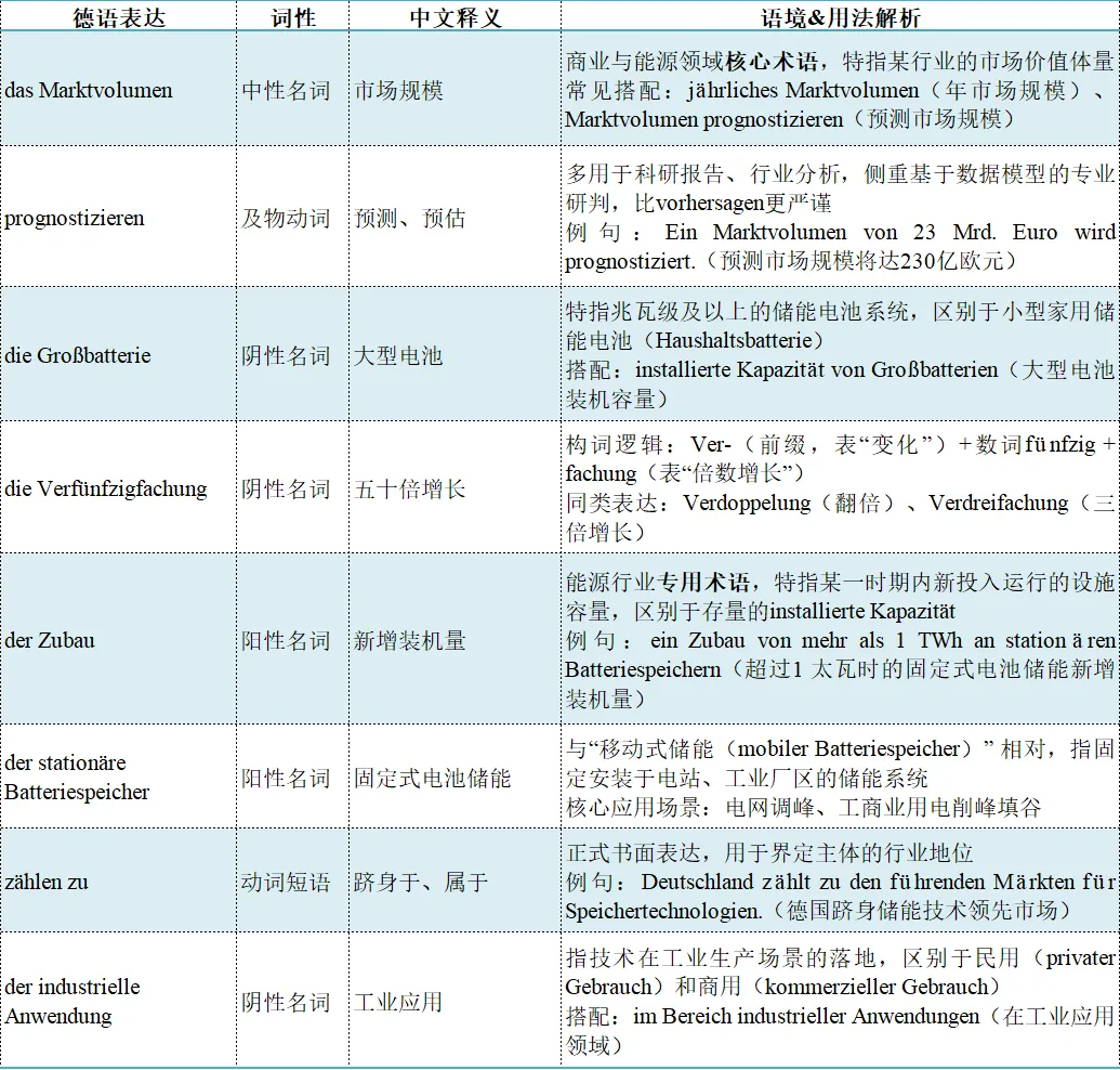 这段文字通过量化数据凸显了德国储能市场的爆发式增长潜力:57GWh的大型电池装机目标(较2020年五十倍增长)、230亿欧元的年市场规模,印证了储能在德国能源转型中的战略地位。同时,全球1TWh的新增装机预期,也体现出储能是全球性的赛道,而德国凭借工业应用的优势,在这一赛道中占据了领先位置。