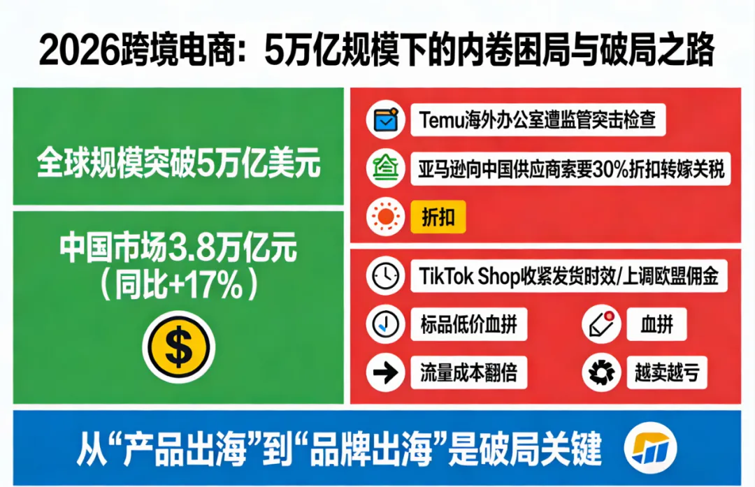 当2026年全球跨境电商规模首次突破5万亿美元大关,中国市场规模预计达3.8万亿元、同比增长17%的利好消息传来时,跨境圈却被一片“内卷”的焦虑笼罩——Temu海外办公室遭监管突击检查,亚马逊向中国供应商索要30%折扣转嫁关税成本,TikTok Shop收紧发货时效并上调欧盟佣金,叠加标品赛道低价血拼、流量成本翻倍上涨,不少卖家陷入“越卖越亏”的恶性循环。曾经“上架就能出单”的蓝海赛道,如今已进入存量竞争的深水区,盈利难、增长难、突围难成为行业常态。在这场白热化的博弈中,单纯依赖“铺货卖货”的粗放模式早已难以为继,唯有实现从“产品出海”到“品牌出海”的跨越,才能打破内卷困局,找到可持续的利润增长路径。