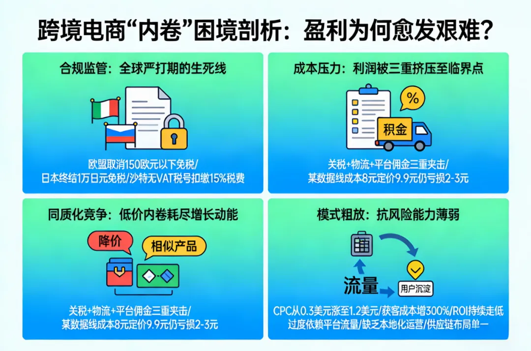 当前跨境电商的“内卷”,早已不是单一维度的价格竞争,而是全方位、多层次的压力叠加,从合规、成本、竞争到模式,多重困境交织挤压盈利空间,让多数卖家陷入“增量不增利”的两难境地,其核心症结可归结为四大方面。