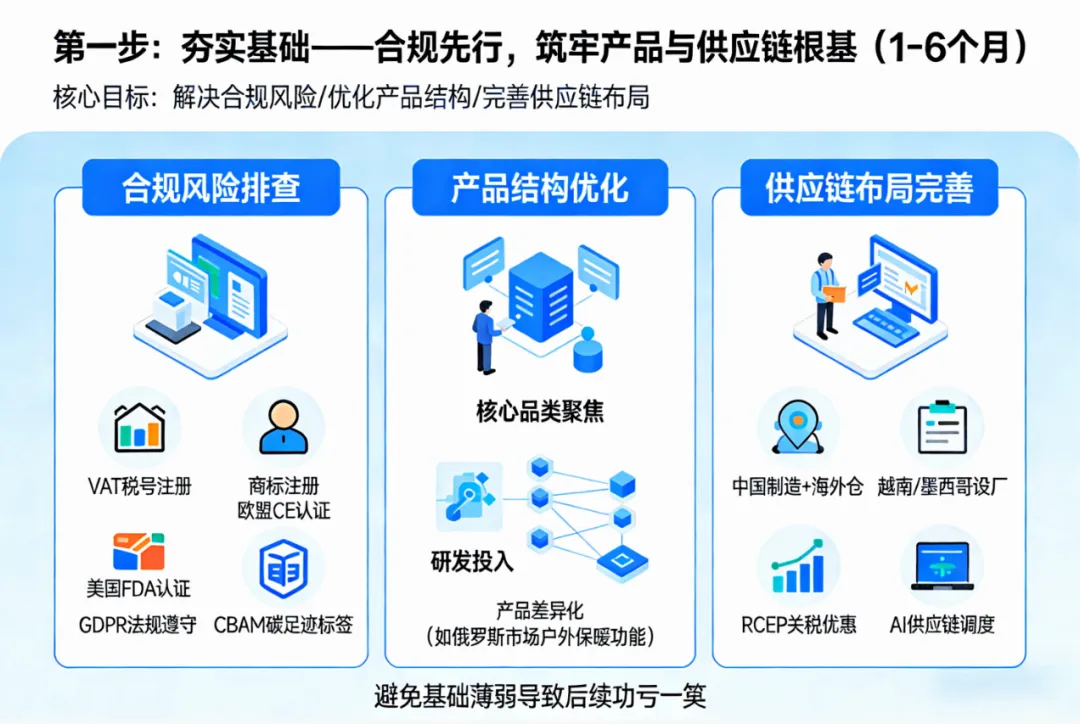 第一步:夯实基础——合规先行,筑牢产品与供应链根基(1-6个月)