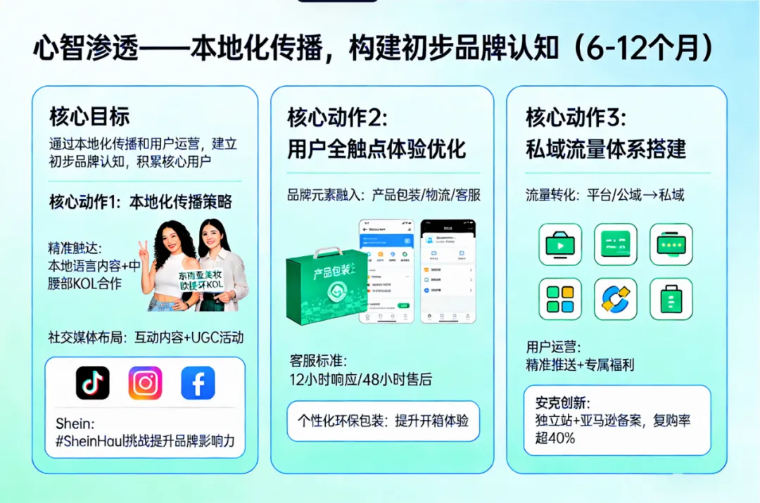 在夯实基础后,进入品牌心智渗透阶段。这一阶段的核心目标,是通过本地化传播和用户运营,让目标市场的消费者认识品牌、了解品牌,建立初步的品牌认知,逐步摆脱对平台流量的依赖,积累核心用户群体。