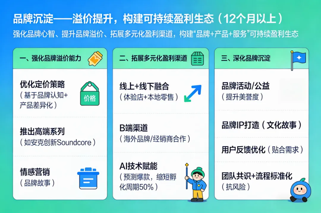 核心动作包括三个方面:一是强化品牌溢价能力,优化定价策略。基于品牌认知和产品差异化优势,逐步提升产品定价,摆脱低价竞争困境,打造中高端品牌形象;推出高端系列产品,满足高端用户需求,进一步提升品牌溢价,例如,安克创新推出高端音频品牌Soundcore,拓展高附加值市场;通过品牌故事、情感营销,让消费者愿意为品牌价值支付溢价,实现“优质优价”的良性循环。二是拓展多元化盈利渠道,降低平台依赖。在巩固独立站和核心平台渠道的基础上,拓展线下渠道,如在目标市场开设体验店、与本地零售商合作,实现“线上+线下”融合发展;拓展B端渠道,与海外品牌、经销商合作,实现批量出货,提升营收规模;借助AI技术赋能全链路,优化选品、营销、供应链等环节,降低运营成本,提升盈利效率,例如,利用AI算法预测爆款,缩短新品孵化周期50%。三是深化品牌沉淀,打造品牌IP。持续传递品牌核心价值,举办品牌活动、公益活动,提升品牌美誉度和影响力;挖掘品牌背后的故事和文化,打造独特的品牌IP,形成强大的品牌凝聚力;关注用户反馈,持续优化产品和服务,让品牌理念始终贴合用户需求,实现品牌价值的持续提升。同时,将品牌思维内化为团队共识,设定不可妥协的底线原则,标准化关键内部流程,确保品牌承诺被持续交付,提升品牌抗风险能力。