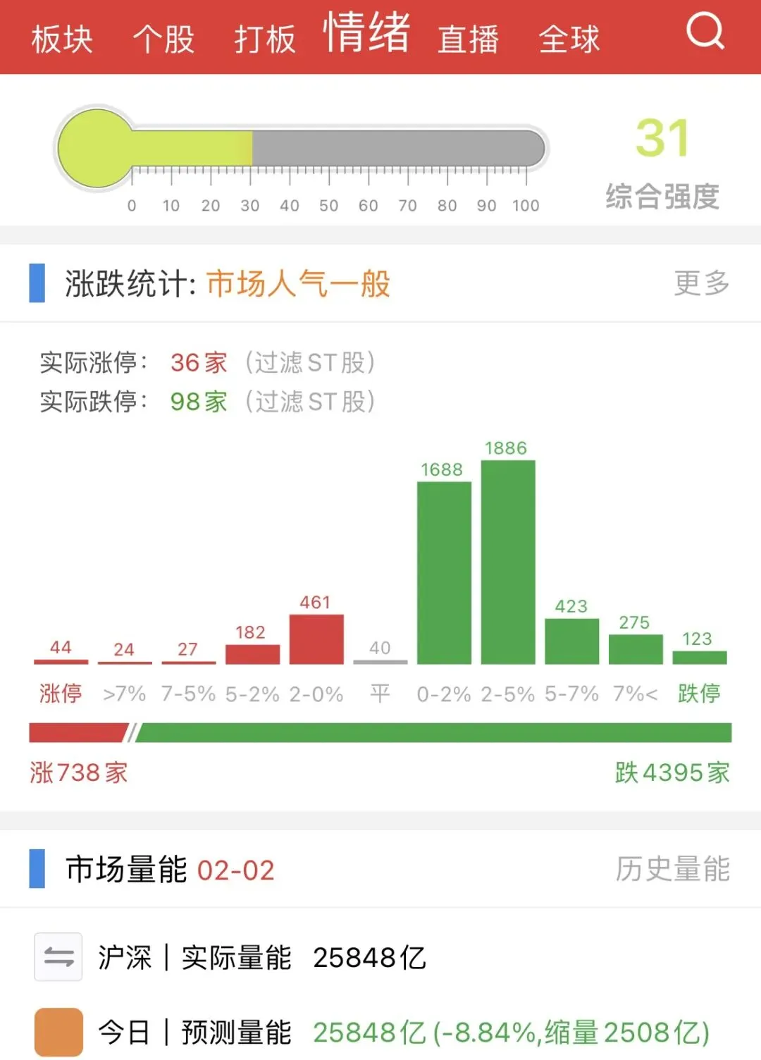 市场上涨家数 738家,下跌家数高达 4395家,实际涨停 36家,而跌停家数达到惊人的 98家,跌停数量接近涨停的3倍,显示出市场情绪的极度低迷。