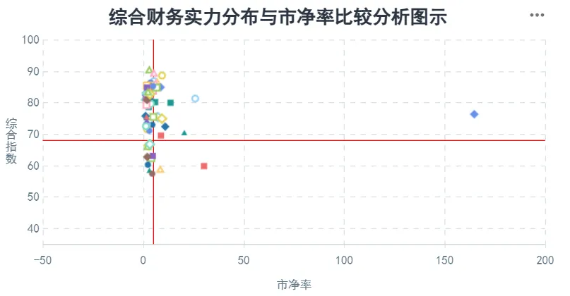 在公司的发展能力、经营稳定性及增长潜力的基础上,结合公司主营业务所属行业的分析、资产结构或资产质量分析、主营业务运营效率分析、受评主体的行业地位分析以及偿付能力的分析做出的公司综合财务实力分析判断。分数越高,公司的综合财务实力越强。处在右下区域的公司,市净率较高且相关指数较低,则存在公司综合财务实力不足的潜在风险。