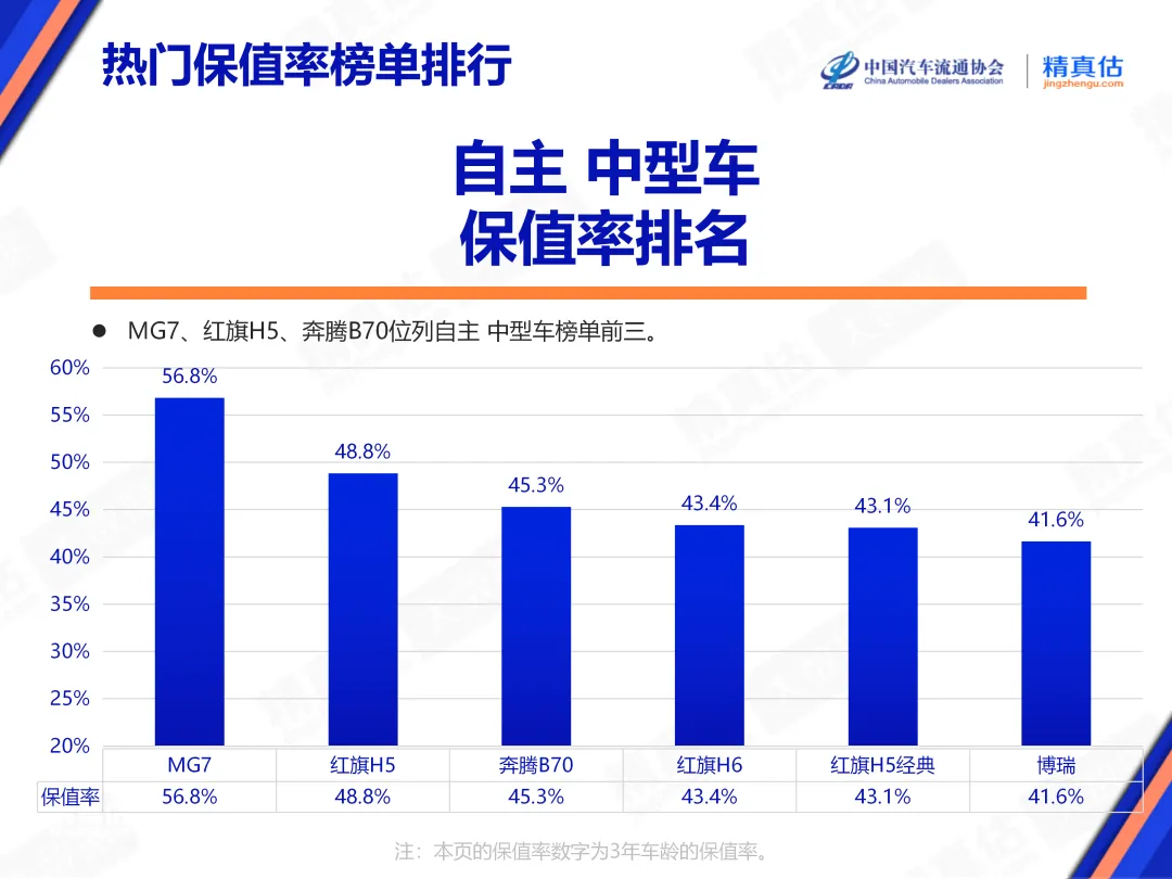 在自主中型车市场,个性化表达与运动化定位,能够有效构筑品牌溢价,并吸引那些追求驾驶激情与个性审美的年轻消费者。MG7凭借“运动轿跑”的纯粹定位,满足车主个性化需求,保值率排名第一,红旗H5、奔腾B70分别位列保值率第二、第三名。