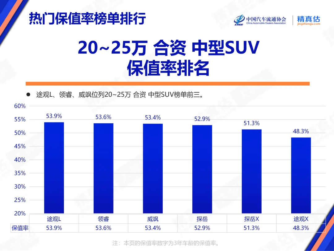 在20~25万合资中型SUV这一竞争最为激烈的核心家用市场,大众途观L已连续多次保值率表现优异,凭借的并非某具体参数极致优秀,而是在空间实用性、动力表现、品牌认可度、售后便利性等多维度,构建了较大的综合优势。领睿、威飒保值率排名第二、第三名。