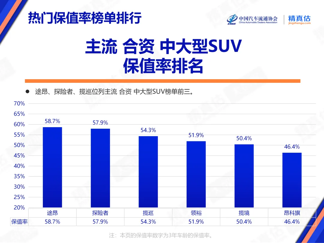 在主流合资中大型SUV市场,素来是品牌技术实力、空间实用性与用户综合口碑的集中体现区。上汽大众的途昂,凭借同级别领先的空间及大众品牌深厚的市场根基和品质信任,保值率排名第一。福特的探险者、一汽大众的揽巡分别位列第二、第三名。