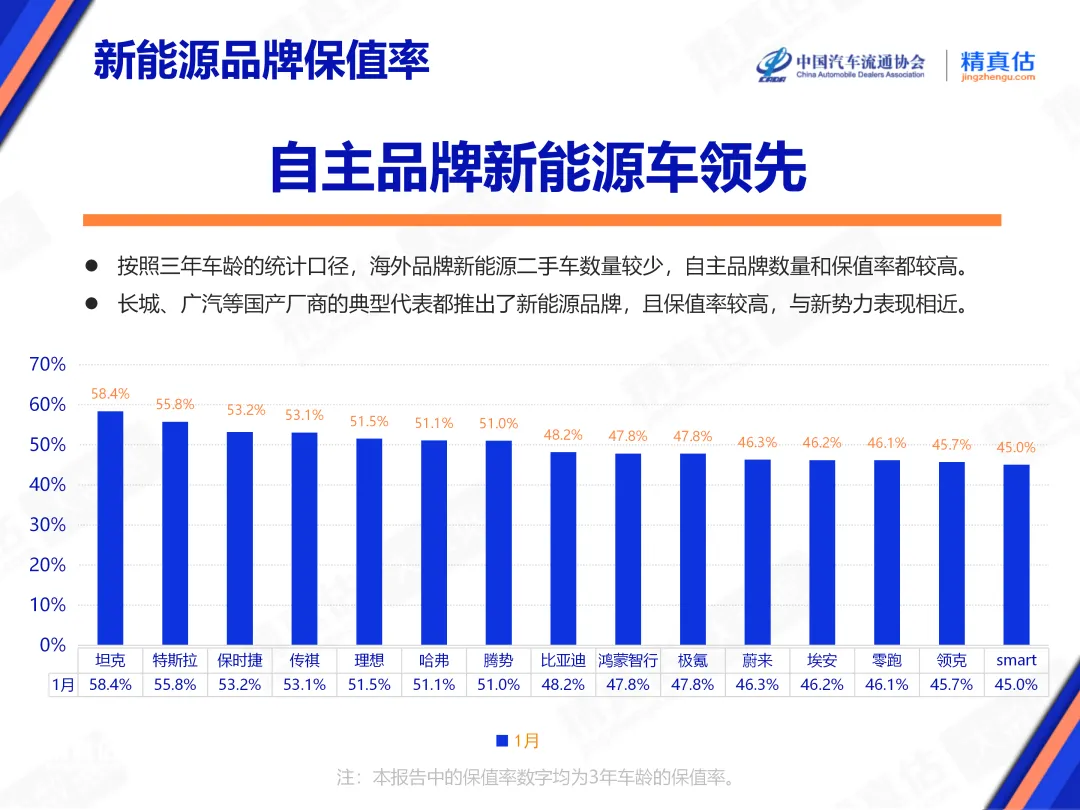 2026年1月主要纯电动车榜单中,一年车龄保值率前三名分别为问界M9、特斯拉Model Y、ZEEKR 009。保值率top15中,自主品牌占比较大。