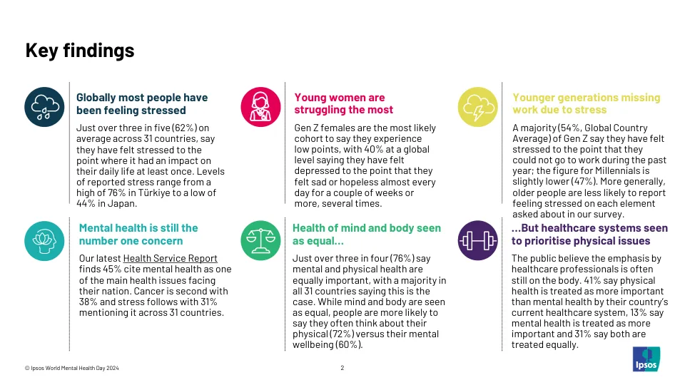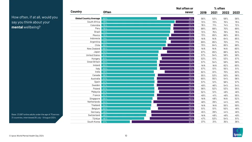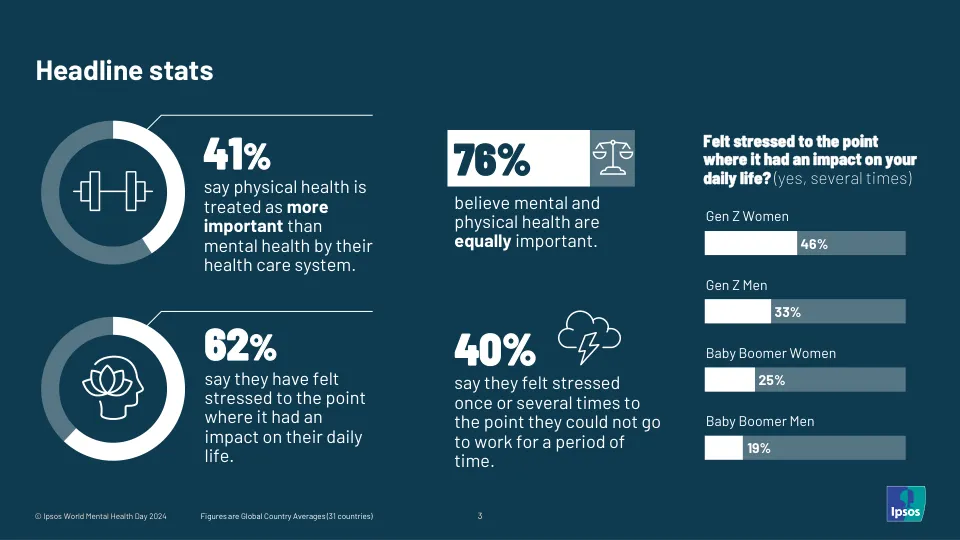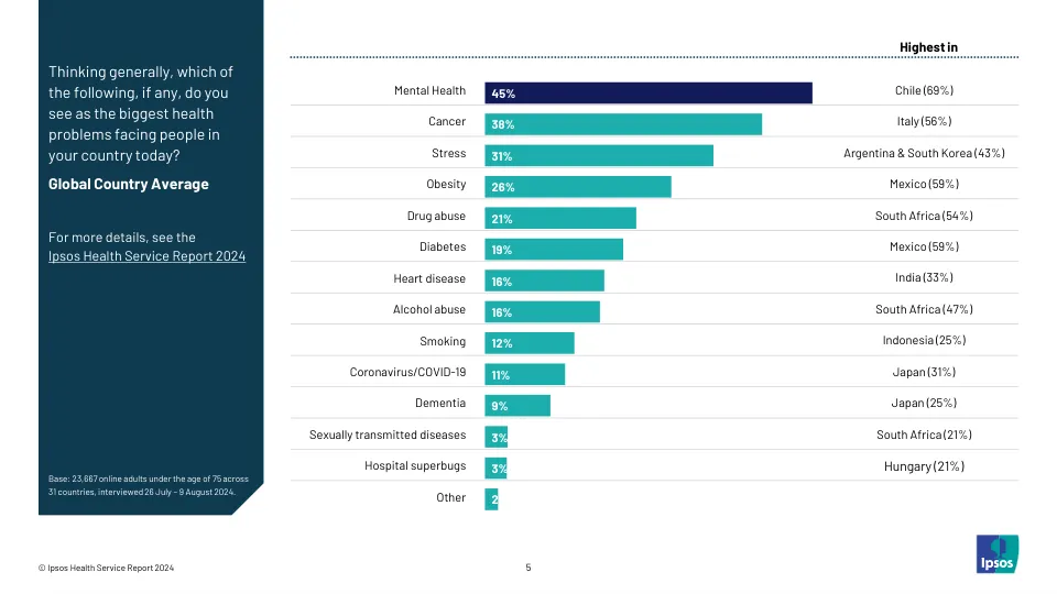 - 公众认知:在31个国家中,45%的人认为心理健康是本国面临的最大健康问题,超过了癌症(38%)和压力(31%)。