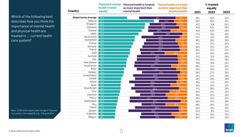 - 医疗体系:41%的人认为本国的医疗系统更重视身体健康,仅有13%的人认为更重视心理健康。