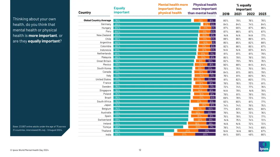 - 观念上平等:76%的人认为心理健康和身体健康同等重要。