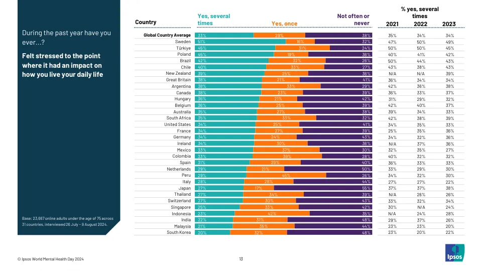 - 地域差异:压力水平最高的国家是土耳其(76%),最低的是日本(44%)。