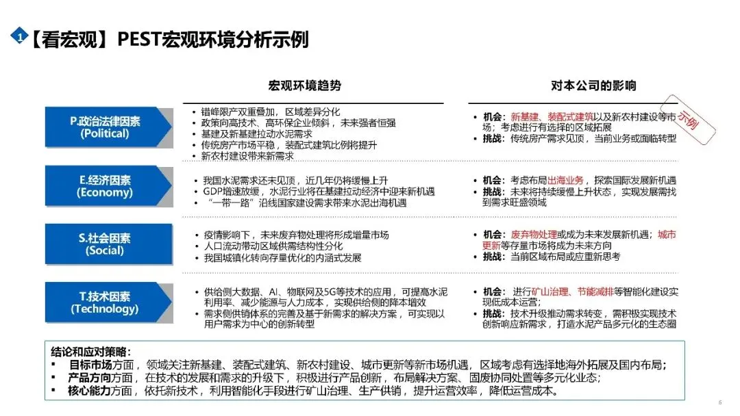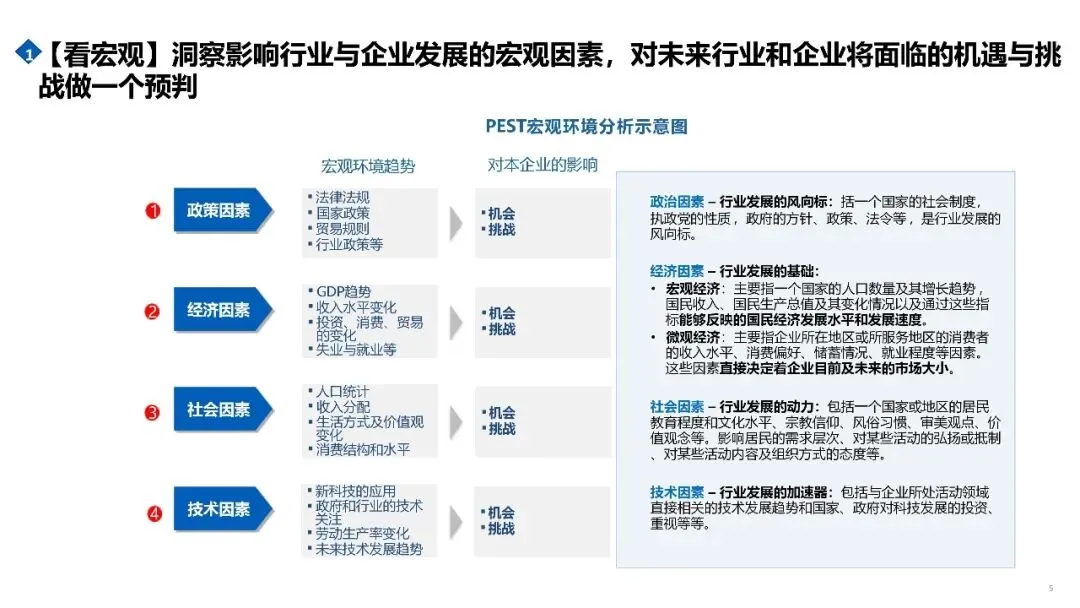 “看宏观”聚焦企业无法控制、但必须应对的外部环境因素。通过政治、经济、社会、技术等维度,识别正在发生且具有持续性的趋势,判断这些变化是否会对行业发展方向、竞争规则或客户行为产生实质影响。