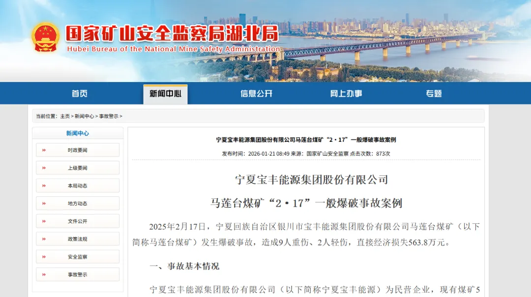 据1月21日国家矿山安全监察网站消息,2025年2月17日,宁夏回族自治区银川市宝丰能源集团股份有限公司马莲台煤矿(以下简称马莲台煤矿)发生爆破事故,造成9人重伤、2人轻伤,直接经济损失563.8万元。