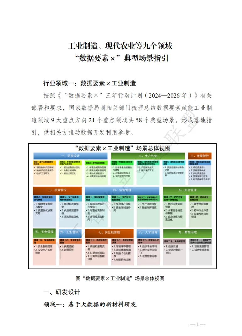 国家数据局: 《工业制造、现代农业等九个领域 数据要素×典型场景指引(2025年)》