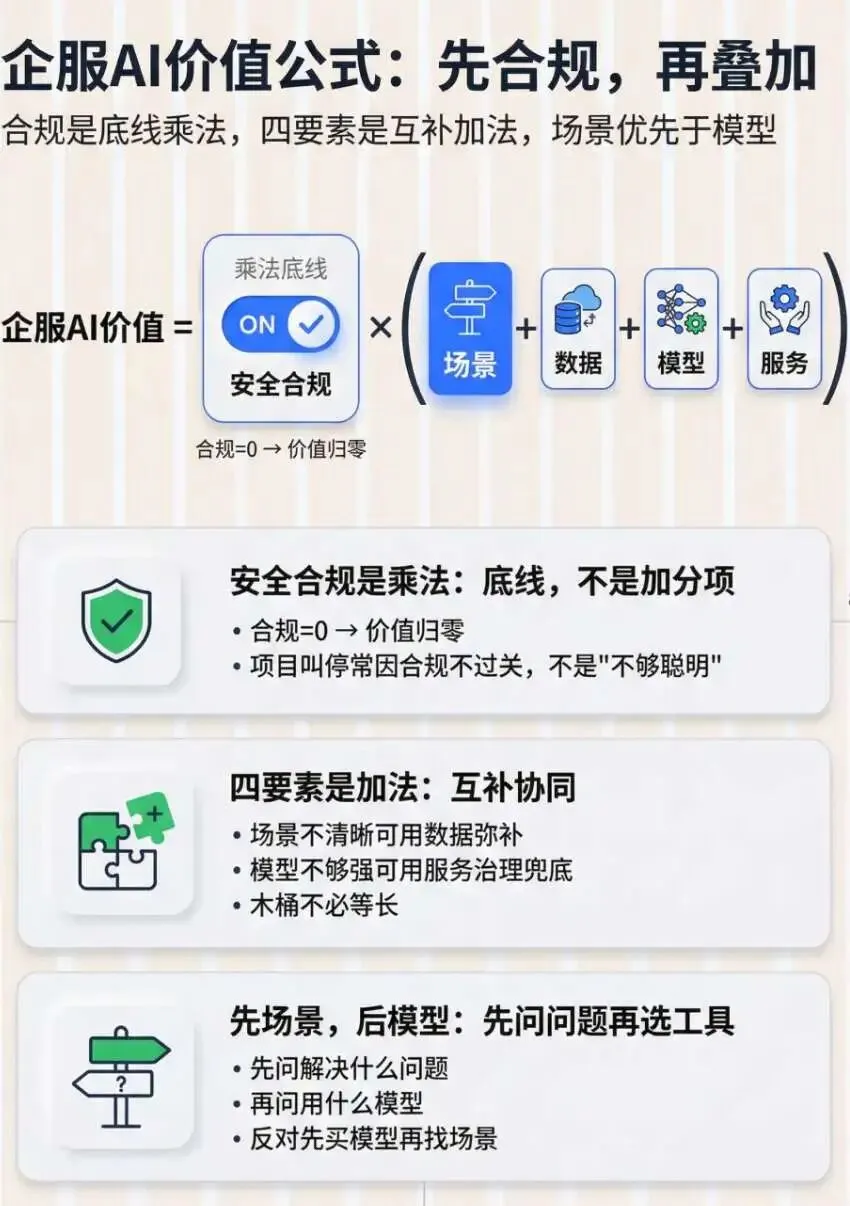 乘法关系的安全合规:这是底线而非加分项。当安全合规为0时,无论其他要素多强,整体价值归零。这解释了为什么很多技术炫酷的AI项目最终被企业叫停——不是不够聪明,而是过不了合规关。 加法关系的四要素:场景、数据、模型、服务之间是互补而非互斥的。场景不清晰可以用数据弥补,模型不够强可以用服务治理兜底。这给了企业"木桶不必等长"的灵活空间。 场景在前,模型在后:刻意的排序暗示优先级。先问"解决什么问题",再问"用什么模型"——这与很多企业"先买模型再找场景"的做法恰好相反。