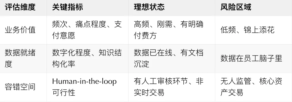 最佳场景:业务流程清晰、数据就绪度高、业务价值高、容错空间大 较好场景:数据有渠道可获取、业务价值清晰、容错空间较大 慎重场景:数据不明确、业务价值不明确且容错空间小 避开场景:业务混杂、数据多样结构不清晰、几乎没有容错空间