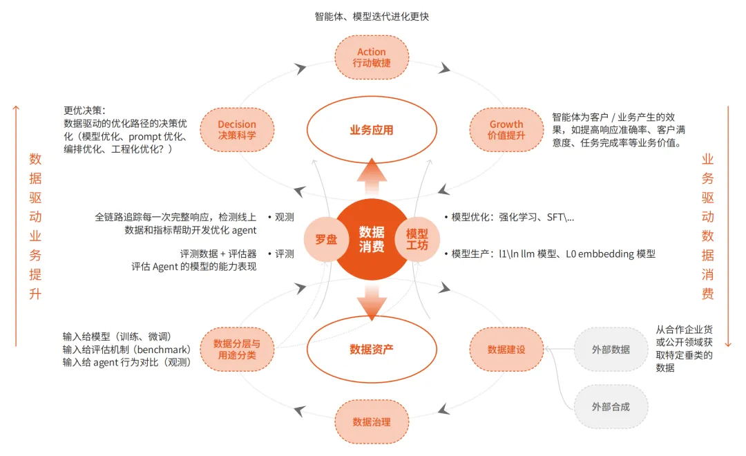 AI应用落地产生数据:交互数据、业务数据、反馈数据 数据治理激活数据价值:清洗、标注、整合,转化为高质量训练数据 反馈驱动模型与应用优化:RAG技术、人机协同调优、模型微调 优化后的AI创造更多价值与数据:更强智能化能力 → 更多用户 → 更多数据