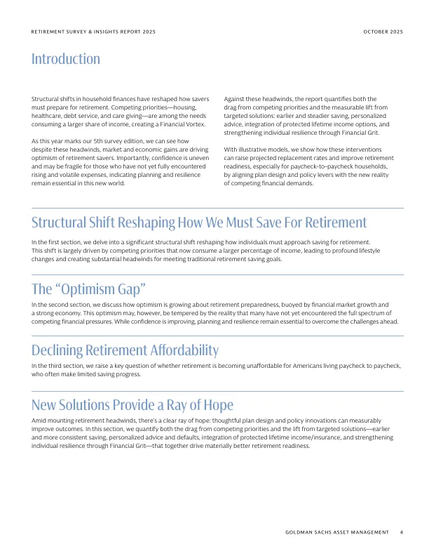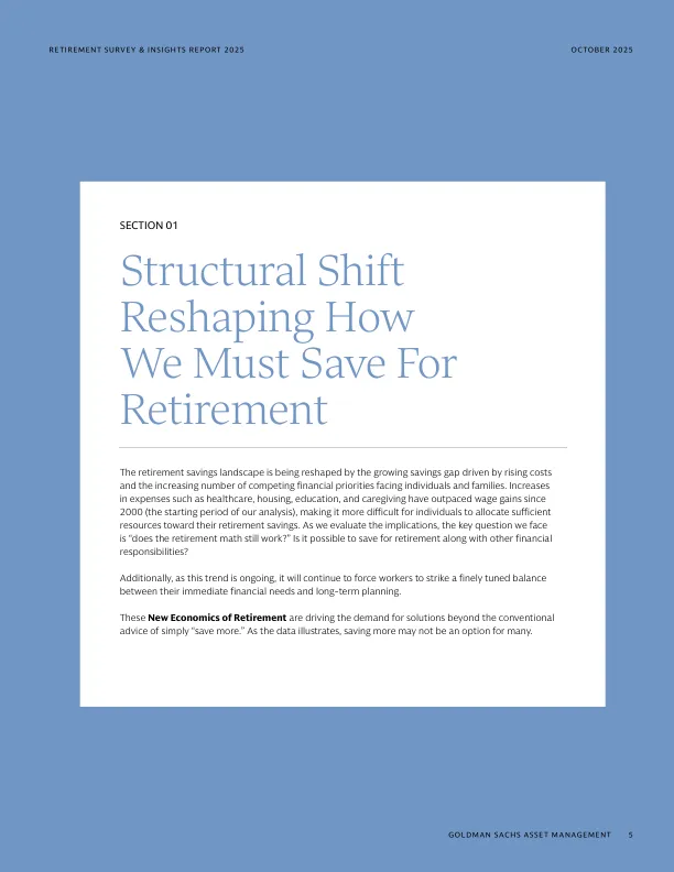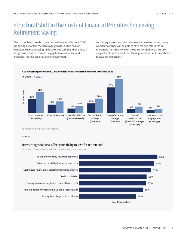 美国人的退休之路正变得前所未有的艰难。高昂的生活成本(住房、医疗、教育、育儿)像一个巨大的“财务漩涡”,吞噬了可用于储蓄的收入,导致许多人陷入“乐观但没钱”的矛盾困境。然而,报告也指出了一线希望:通过更早开始储蓄、利用个性化规划、采用创新的金融工具(如年金)以及培养“财务韧性”,个人和政策制定者仍能共同改善退休前景。