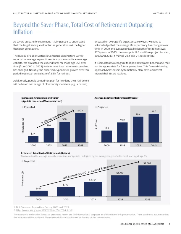- 寿命延长:平均退休时长从2000年的17.5年延长到2023年的19.2年,并预计继续增长。