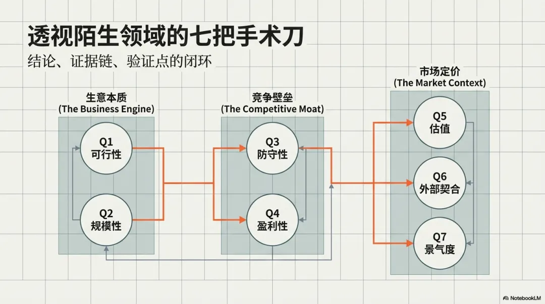 明确了研究对象和所处阶段后,我们就可以通过以下七个层层递进的问题,构建一个完整的判断闭环。这个框架的目的不是为了写报告,而是为了得出结论、构建证据链并找到关键的验证点。