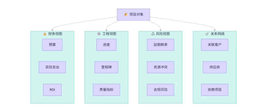 传统系统把"项目"存储为数据库中的一条记录,不同部门看到的是不同表格。Data Agent采用语义化建模: