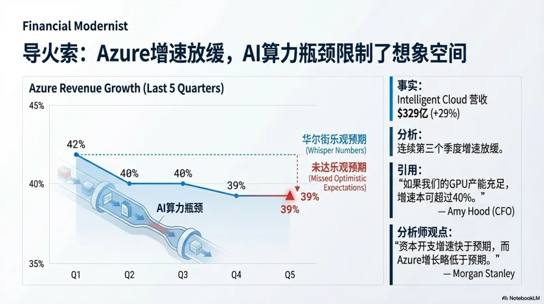 而且更关键的是,把时间线拉长,你会发现一个趋势正在形成:Azure 已经连续三个季度增速放缓。市场看到的不是一辆还在疾驰的火车,而是一条“斜率在变小”的曲线。