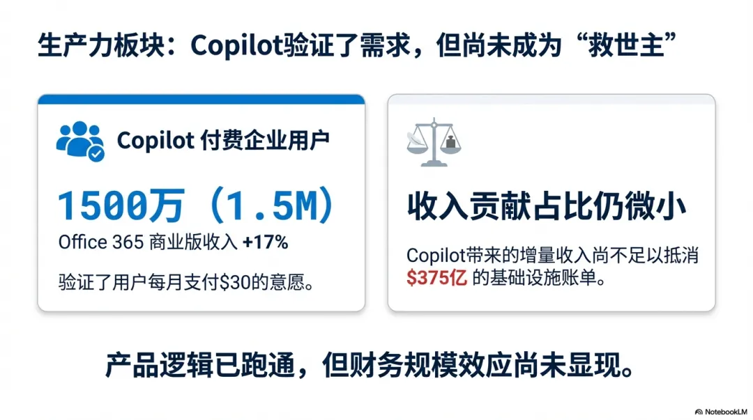 微软当然不是“只花钱不产出”。它最被寄予厚望的 AI 商业化产品之一——Copilot——这次披露的数据非常亮眼:企业版 M365 Copilot,每人每月 30 美元,付费用户已经达到 1500 万。