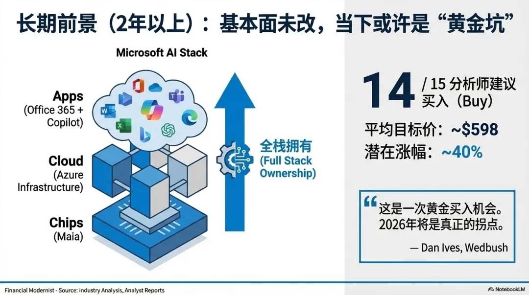 微软在云计算和企业办公软件上拥有近乎不可动摇的护城河。AI 的高投入牺牲的是短期利润,换的是未来几年 AI 应用爆发时的统治地位。