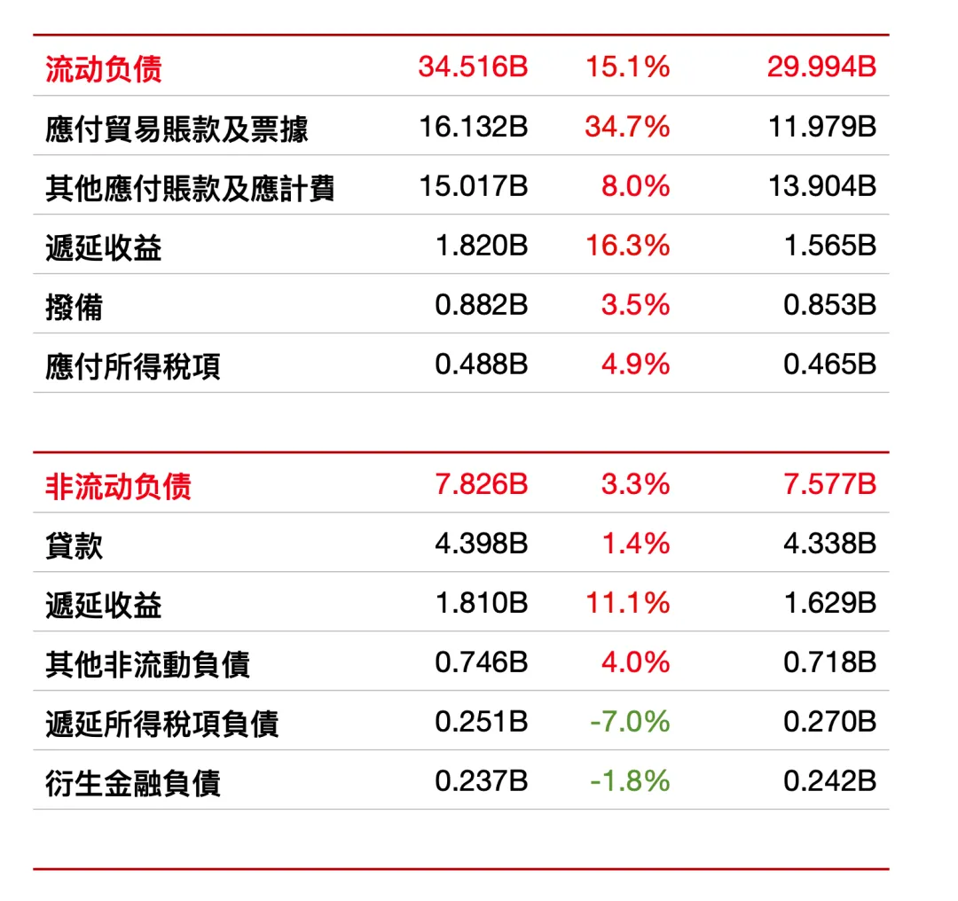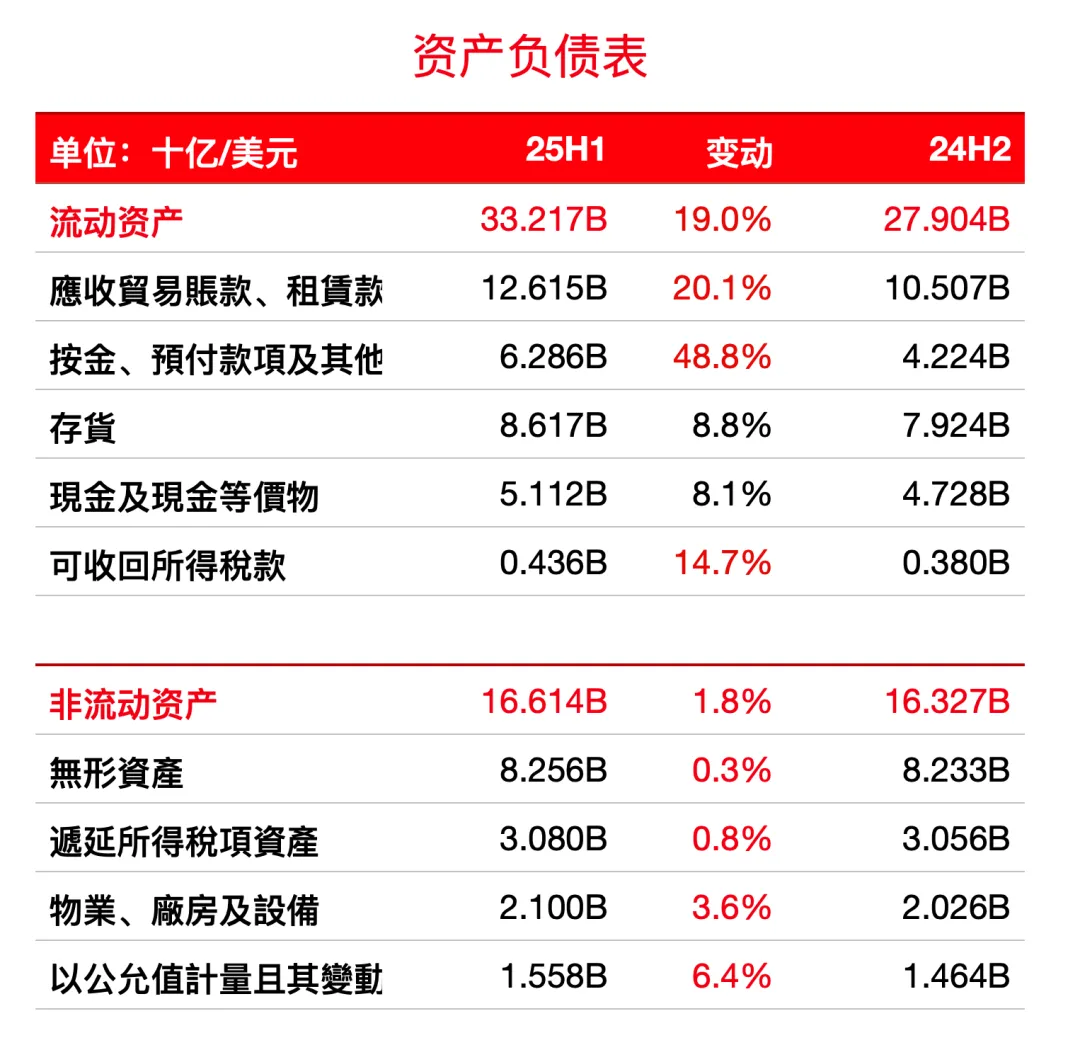 上图是资产端的财务数据(单位是美元),流动资产332亿,现金及现金等价物51亿,只占15%;流动资产的大头是应收帐款、