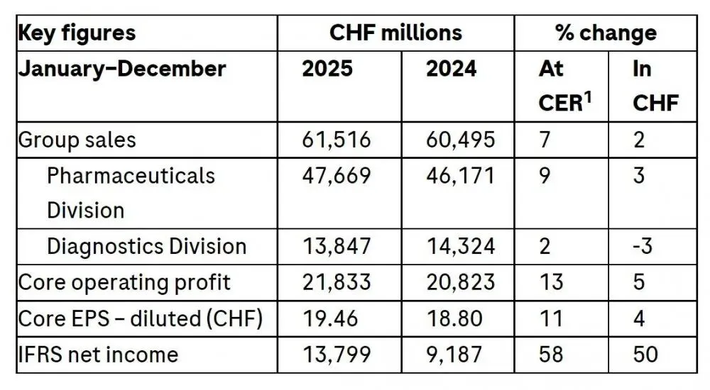 近日,全球医疗健康巨头罗氏集团公布了其2025年全年业绩。报告显示,罗氏的业绩表现强劲,集团全年销售额按固定汇率计算增长7%,总额达615亿瑞士法郎。核心运营利润增长更为显著,增幅达13%,利润增速超过收入增速。