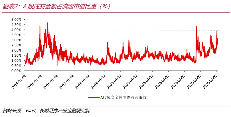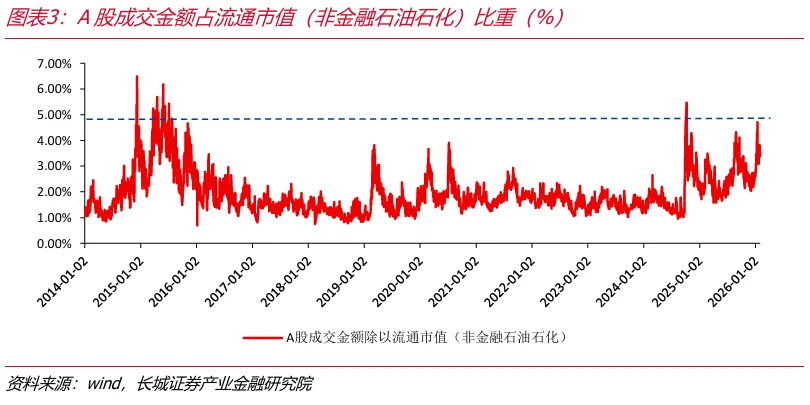 (1)上周(2026.1.26-2026.2.1)A股单日平均成交金额为30632亿元,延续自1月中旬以来的下降走势,A股市场情绪有所降温,成交金额维持在3万亿附近表明市场动能仍相对充足。从A股成交金额占流通市值的比重来看,1月14日占比为3.85%,达到阶段性高点,但是仍未触及2025年10月8日的高点水平,也未触及2014年、2015年的高点。