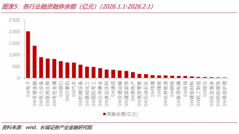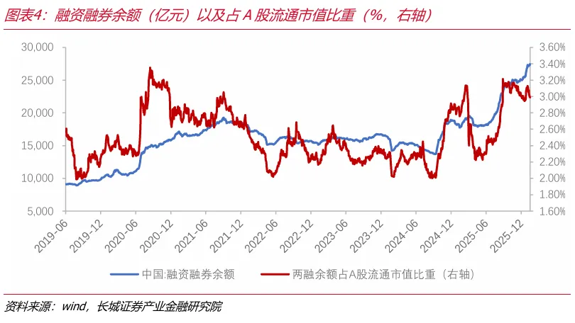 两融方面,上周两融余额维持在27000亿元以上,2026年以来两融余额呈现上升趋势,两融余额占A股流通市值比重自1月中旬以来小幅回落。近一个月,两融余额占比较高行业为电子、非银金融、电力设备、医药生物、有色金属、银行、计算机、汽车等,电子、非银两融余额占比明显高于其他行业。