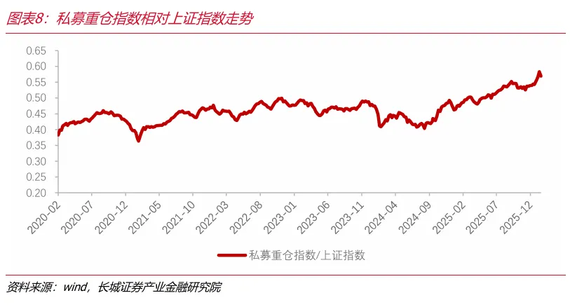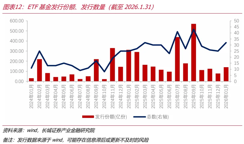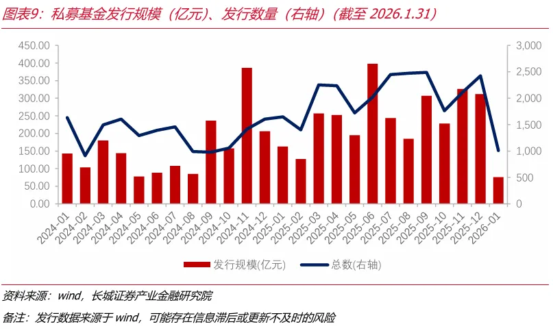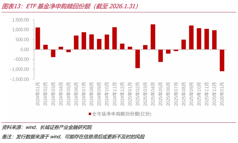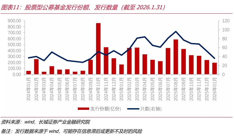 公募方面,1月以来,主动股票基金指数和被动股票基金指数相对走势均有所上升。股票型基金发行份额自2025年8月以来持续下降。ETF基金发行份额和发行数量今年1月有所回升。自2025年9月以来ETF单月净申购份额呈现持续下降的走势,2026年1月ETF单月净申购份额为-1096.45亿份,或存在阶段性获利了结行为。
