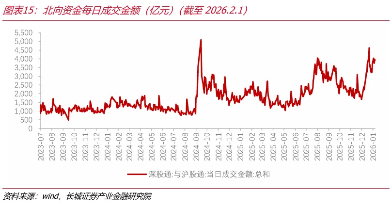 (3)自2025年12月底以来,北向资金单日成交金额大幅上升,上周北向资金成交金额较前周继续上升,反映出北向活跃度和市场情绪相对偏强。上周南向资金整体呈现为净流入,但是净流入规模仍相对偏低。