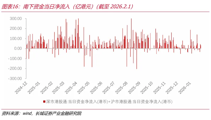 自2025年12月底以来,北向资金单日成交金额大幅上升,上周北向资金成交金额较前周继续上升,反映出北向活跃度和市场情绪相对偏强。上周南向资金整体呈现为净流入,但是净流入规模仍相对偏低。