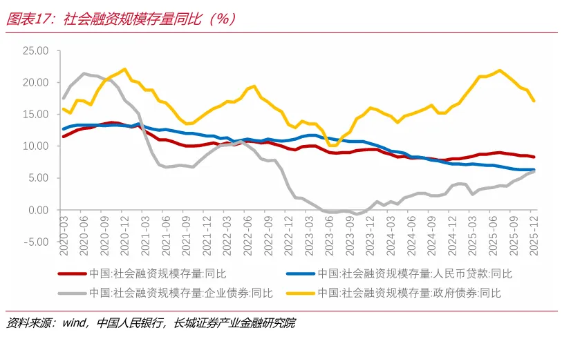 2025年12月,中国社会融资规模存量同比为8.3%,较上月下降0.2个百分点。其中,人民币贷款、企业债券、政府债券同比分别为6.3%、6.0%、17.1%,企业债券同比较上月上升,政府债券同比较上月下降。