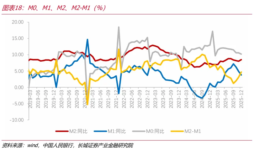 12月,M1同比为3.8%,较上月下降1.1个百分点。M2同比为8.5%,较上月上升0.5个百分点。12月M2-M1同比差值为4.7%,差值继续扩大。