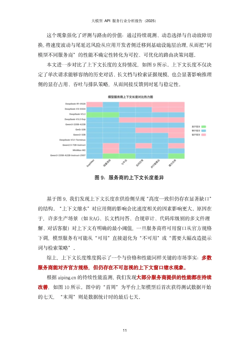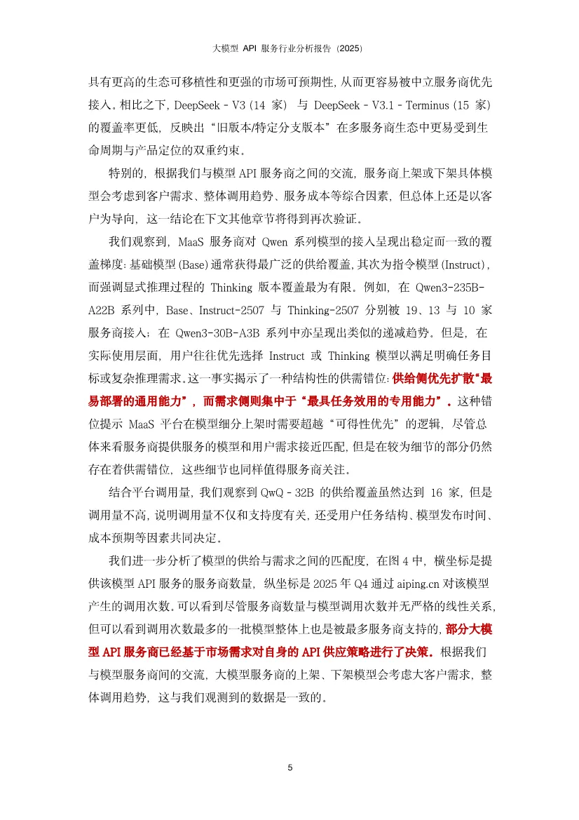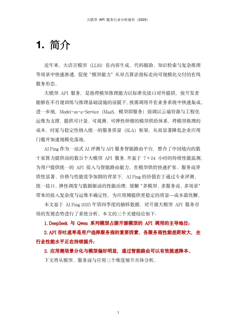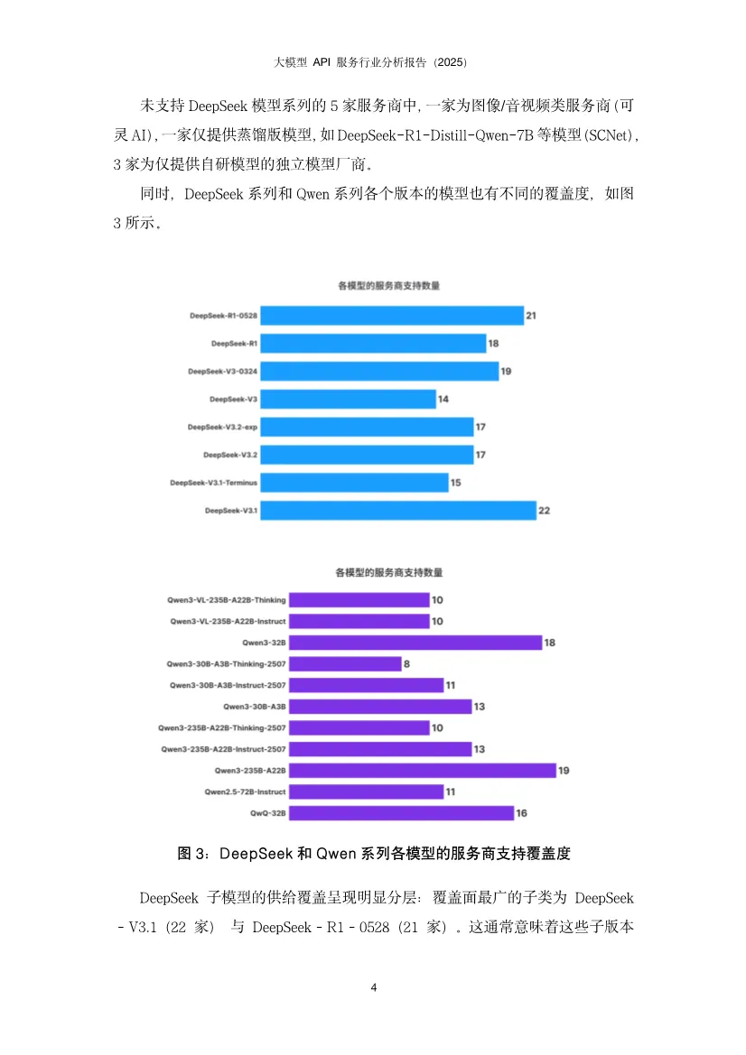 这份报告揭示了中国大模型API服务市场正从"野蛮生长"走向"精细运营"阶段,核心竞争点已从单纯的价格战转向性能、稳定性与智能调度的综合能力竞争。基于AI Ping平台2025年Q4真实调用数据,报告描绘出一幅供给端快速扩张、需求端深度分化、中间层智能路由价值凸显的生态全景图。开源模型调用呈现DeepSeek与Qwen双寡头格局。DeepSeek-V3/R1以绝对优势占据调用量首位,其后是DeepSeek-V3.2;Qwen家族的多款模型(Qwen3-32B、Qwen2.5-72B、Qwen3-235B-A22B等)紧随其后,形成"少数强势型号占大盘、同一家族多版本并存"的稳定结构。反直觉现象:Qwen2.5-72B等高调用量"老模型"并未被新版本快速替代。这源于企业应用的工程惯性——大量AI应用已围绕这些稠密架构完成验证、调优与线上回归体系,迁移成本高且风险大。用户更倾向于选择"经过业务验证的稳定基线",而非理论更强但未经工程化验证的新模型。这表明模型选择是能力、成本与可验证性的综合博弈,而非简单的性能追逐。服务商覆盖度:DeepSeek系列获得最广泛支持,29家服务商中有24家提供至少一种DeepSeek模型。Qwen系列呈现"基础模型覆盖最广、指令模型次之、思考版本最少"的梯度,揭示供给侧"易得性优先"与需求侧"任务效用导向"的结构性错位。价格并非核心变量。多数服务商定价紧贴官方,小幅调整,说明官方定价在生态中起强锚定作用。尽管如此,SophNet、SCNet等少数服务商采取激进低价策略,暗示价格战存在于长尾市场,而非主流战场。激活参数比总参数更贴近成本。MoE模型的总参数量反映"模型体量",但单次推理的实际计算量由激活参数决定。数据显示,即便激活参数量相近,价格区间仍可显著分化。这意味着定价机制尚未完全反映技术成本结构,为精细化运营留下空间。上下文长度是隐性门槛。多数服务商能对齐官方规格,但存在"窗口缩水"现象。对于RAG、长文档问答、代码库理解等场景,上下文从32K缩水到16K可能导致服务从"可用"直接降为"不可用"。这比性能波动的影响更致命,因为它直接决定了服务能否进入生产环境。性能异质性远超价格差异。在首字延迟(TTFT)和端到端完成速度上,第三方服务商与官方API差异显著,且官方渠道并不天然最优。大量数据显示第三方可系统性超越官方,同时也有部分服务商性能不及官方。这强化了评测与路由的核心价值:将"同模型不同服务商"的不确定性转化为可优化的决策问题。性能持续优化是行业常态。对比模型上线首周与末周数据,TTFT分布整体下移,箱体(25%-75%分位区间)变窄,极端慢启动情形减少。说明服务商在持续进行算力优化、调度改进与缓存策略调优。性能优化是持久战,而非一次性配置。接口质量分化严重。部分平台在失败场景缺乏明确错误返回,表现为长时间无响应后超时;不同平台失败率差异显著,高并发下失败率放大;错误返回规范性不一致,状态码与真实原因不匹配,信息泛化缺乏上下文。这些问题导致接口行为可预期性下降,直接影响大规模场景下的系统稳定性。慢响应高度集中。少数服务商在百万级调用量下慢响应比例低于0.3%,体现成熟基础设施优势;也有服务商在较小调用量下慢响应比例高达5%,指向资源冗余不足、冷启动频繁、调度链路长等问题。性能差异已成为用户用脚投票的核心依据。输入输出结构差异显著。新闻资讯类任务呈现"长输入、短输出"特征,依赖大量上下文检索;创意写作与商业服务为"长输入、长输出",成本与体验高度敏感;内容营销偏向"中输入、高输出";专业服务、知识翻译等则集中在"中短输入、中等输出",对延迟与稳定性更敏感。这揭示单一路由目标(只看价格或速度)无法覆盖所有场景,必须感知任务形态才能"提速降本不牺牲体验"。模型与任务存在稳定匹配结构。不同模型在不同任务类别上的使用占比呈现强烈集中,而非均匀分布。部分模型在知识/语言任务上占主导,另一些在创意写作、内容营销等风格化场景中占优。企业客户一旦验证某模型能稳定满足特定场景的质量、成本与交付约束,调用会固化到生产流程中,导致跨任务偏好差异更明显、模型间分工边界更清晰。路由策略偏好性能导向。调研显示,"性能优先"策略用户占默认路由的77.1%,说明推理速度是获客与留存的关键竞争要素。当模型服务同质化,延迟和吞吐更直接映射产品可用性与用户感知质量,成为用户主动选择的首要目标。智能路由将不确定性转化为优化空间。通过持续观测、动态选择与自动故障切换,智能路由在成本与性能上实现显著优化:- 成本降低36%:在约150万次请求样本中,智能路由总成本4577元,对比官方定价7355元,节省37.8%。- 吞吐提升90%:DeepSeek-V3.2模型在智能路由下平均TPS提升约90%,长输出(>1000 token)场景提升更显著。- 长尾优化:分位数角度观察,低速情况减少、高速情况增多,极端慢启动/低吞吐情形发生频率降低。路由策略需任务感知。基于输入输出长度将任务分为四象限:长入长出型需联合成本最小化;短入长出型优先优化输出价格;短入短出型以低延迟为主;长入短出型则聚焦输入价格与预填充性能。这种精细化策略比单一维度路由效果提升一个数量级。快速跟进者:SophNet、UCloud、七牛云、派欧云等能在模型发布当日完成上线,以"上架延迟"换"早期流量与开发者心智",抢占生态位。聚焦优化者:蓝耘将资源集中于DeepSeek-V3.2,商汤大装置模型覆